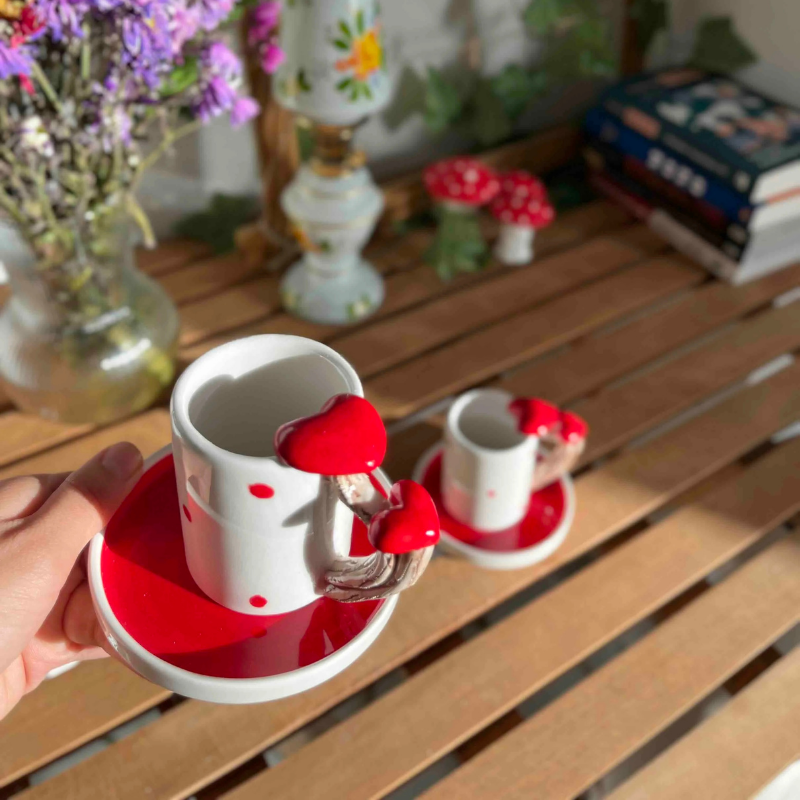 Aşkın en zarif hali kahve keyfinizde! 💞 El yapımı kalp tasarımıyla romantik bir dokunuş sunan bu özel fincan takımı, her yudumu sevgiyle doldurur. İster kendinize ister sevdiklerinize, kalpten bir hediye.